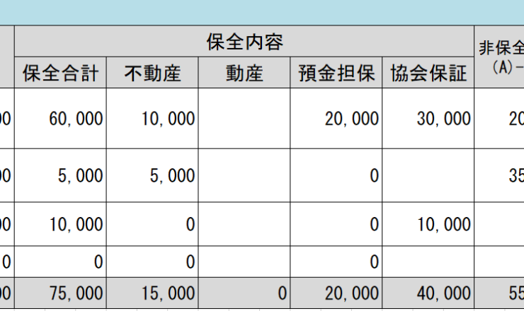 経営改善計画では、金融機関別の保全状況も確認していきます。金融機関別の債権保全状況は、取引金融機関別の有利子負債の残高から、担保資産(不動産、預金...