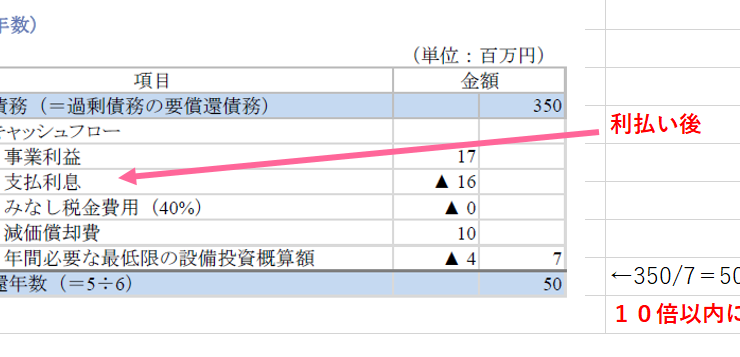一般的に、過剰債務は要償還債務から利払前キャッシュフローの10倍を差し引いて試算します(経営改善計画の場合)。