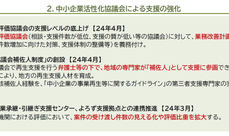再生支援の総合的対策の2つ目の施策として、「中小企業活性化協議会による支援の強化」があります。内容としては。 ●低評価協議会の支援レベルの底上げ【...