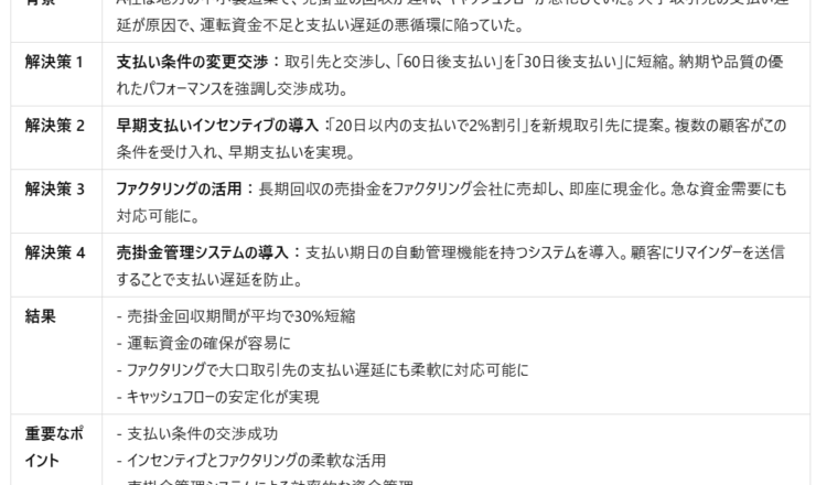 背景 A社は、地方の中小製造業で、部品の製造を行い、取引先へ納品していました。しかし、売掛金の回収が60日後や90日後となることが多く、キャッシュフ...
