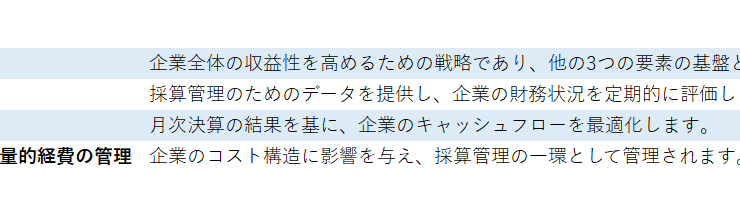 1. 経営改善施策のモニタリング方法 – 詳細記載 経営改善計画の各項目に、実施時期、内容、担当者を詳細に記載。 -責任と実現可能性 経...