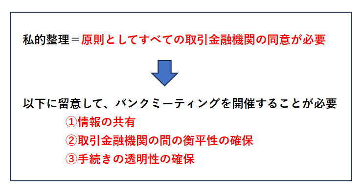 経営改善計画が完成した後、バンクミーティングの開催の必要性については以下の通りです。 – 私的整理では、経営改善計画の成立には金融支援...